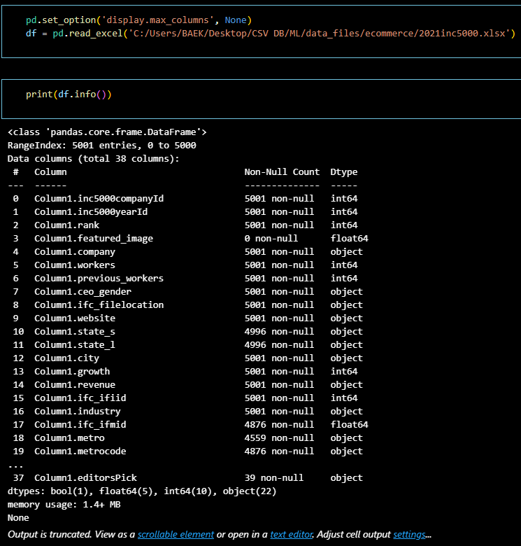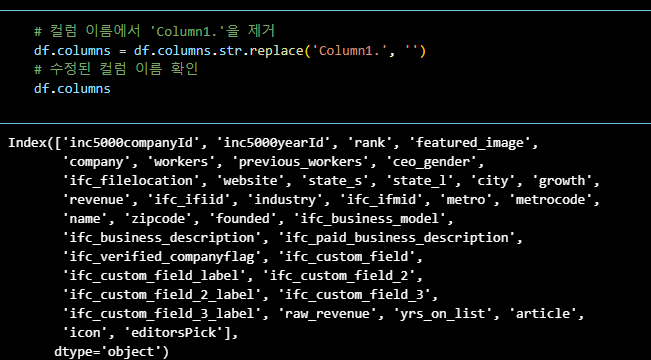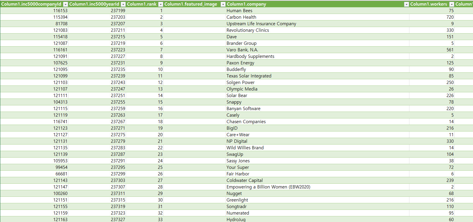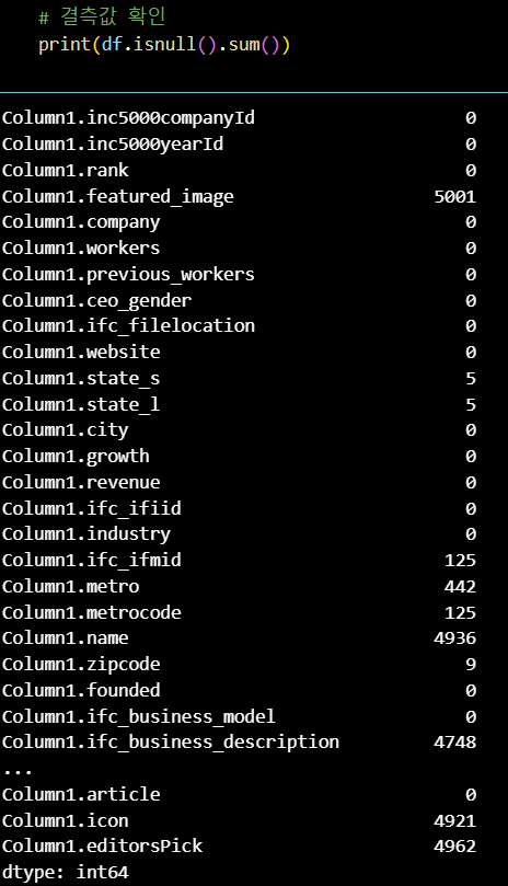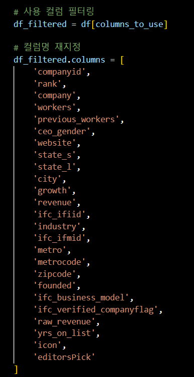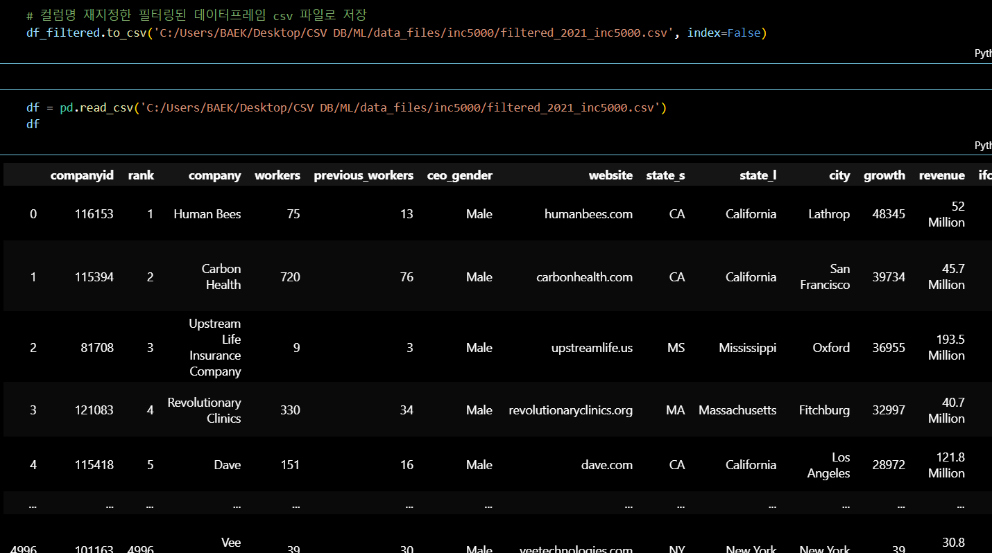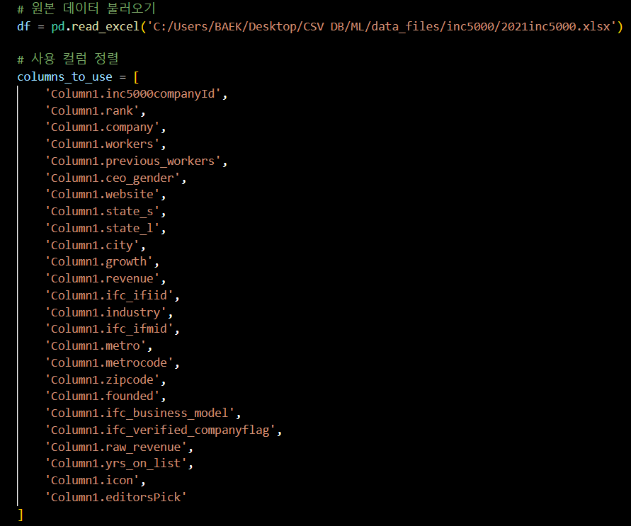 데이터셋 컬럼 상세 inc5000companyid: Inc5000 회사의 고유 ID inc5000yearid: 데이터가 기록된 연도의 ID rank: 해당 연도의 Inc5000 순위 featured_image: 회사에 대한 특징 이미지 파일 위치 company: 회사 이름 workers: 현재 직원 수 previous_workers: 이전 연도의 직원 수 ceo_gender: CEO의 성별 ifc_filelocation: 파일 위치 website: 회사 웹사이트 주소 state_s: 주(state) 약어 state_l: 주(state) 전체 이름 city: 도시 growth: 성장률 revenue: 연간 매출 ifc_ifiid: ifiid industry: 산업 분류 ifc_ifmid: ifmid metro: 광역지역 metrocode: 광역지역 코드 name: 이름 zipcode: 우편번호 founded: 설립 연도 ifc_business_model: 사업 모델 ifc_business_description: 사업 설명 ifc_paid_business_description: 유료 사업 설명 ifc_verified_companyflag: 검증된 회사 플래그 ifc_custom_field: 사용자 정의 필드 ifc_custom_field_label: 사용자 정의 필드 레이블 ifc_custom_field_2: 사용자 정의 필드 2 ifc_custom_field_2_label: 사용자 정의 필드 2 레이블 ifc_custom_field_3: 사용자 정의 필드 3 ifc_custom_field_3_label: 사용자 정의 필드 3 레이블 raw_revenue: 원시 매출 yrs_on_list: 목록에 올라간 연수 article: 기사 icon: 아이콘 editorspick: 편집자 추천