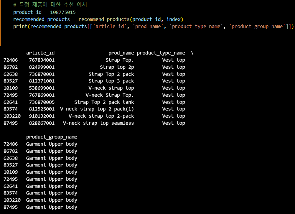 recommend_products 함수는 주어진 product_id에 대해 유사한 제품을 찾음.