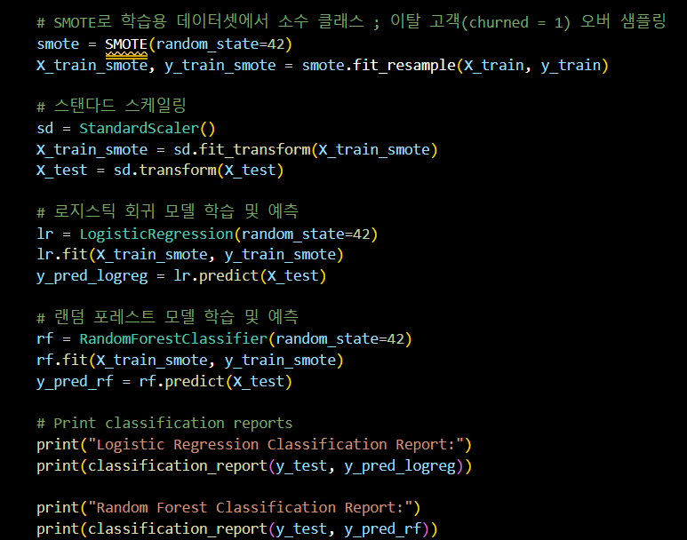 # SMOTE로 학습용 데이터셋에서 소수 클래스 ; 이탈 고객(churned = 1) 오버 샘플링