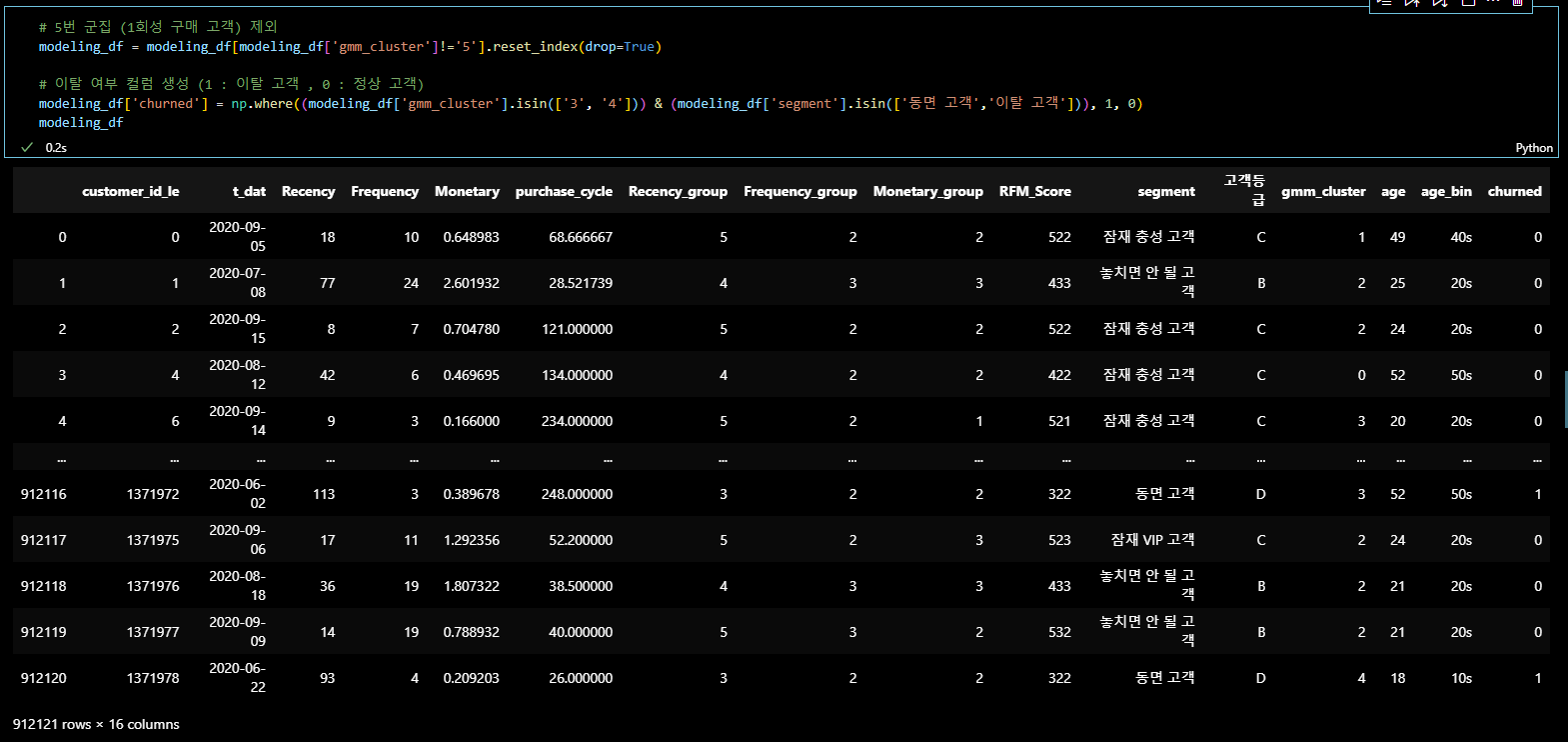 modeling_df['churned'] = np.where((modeling_df['gmm_cluster'].isin(['3', '4'])) & (modeling_df['segment'].isin(['동면 고객','이탈 고객'])), 1, 0)