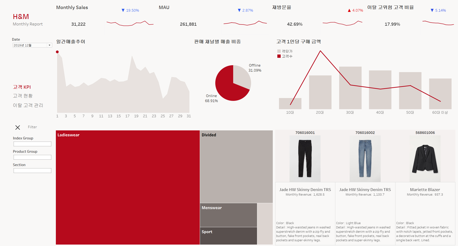 제품 그룹 드릴다운 필터링과 오른쪽 Top3 상세정보 미연동