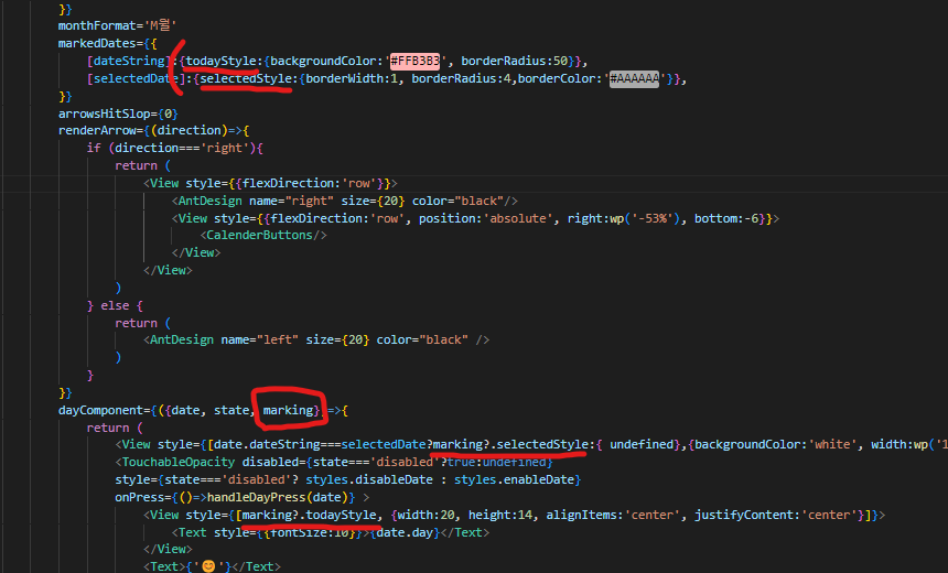 marking은 Calendar에 markedDates라는 속성이 있는데, markedDates에 ['2024-05-24']: {스타일값} 이렇게 들어있다면 해당 날짜와 동일한 Day Component에 스타일값이 marking에 들어가 있었다. 아래 사진을 보면 어떻게 활용했는지 알 수 있다.