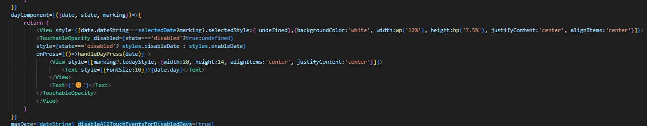 우선 기존 방식은 TouchableOpacity와 그 내부요소로 이루어진 Day Component였던것같다. 나는 여기에 추가로 이모지를 넣고자 했기때문에 View로 TouchableOpacity와 Text를 감싸주었다. 나중에는 저 Text 태그 내에 이모지를 날짜에 맞게 동적으로 넣어줄 예정이다.