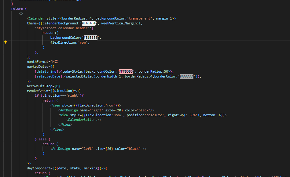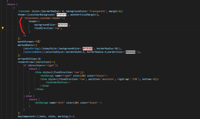 이렇게 상단부분을 설정할 수 있는 스타일속성인데, 여기에 접근하는 순간 기존에 있던 스타일들이 전부 풀린다. 그래서 화살표와 달(month)이 왼쪽에 치우쳐진 Column 스타일로 변경이 된다. 나는 이곳에 backgroundColor를 바꾸고 flexDirection:'row'를 통해 다시 가로 스타일로 만들어주었다.
