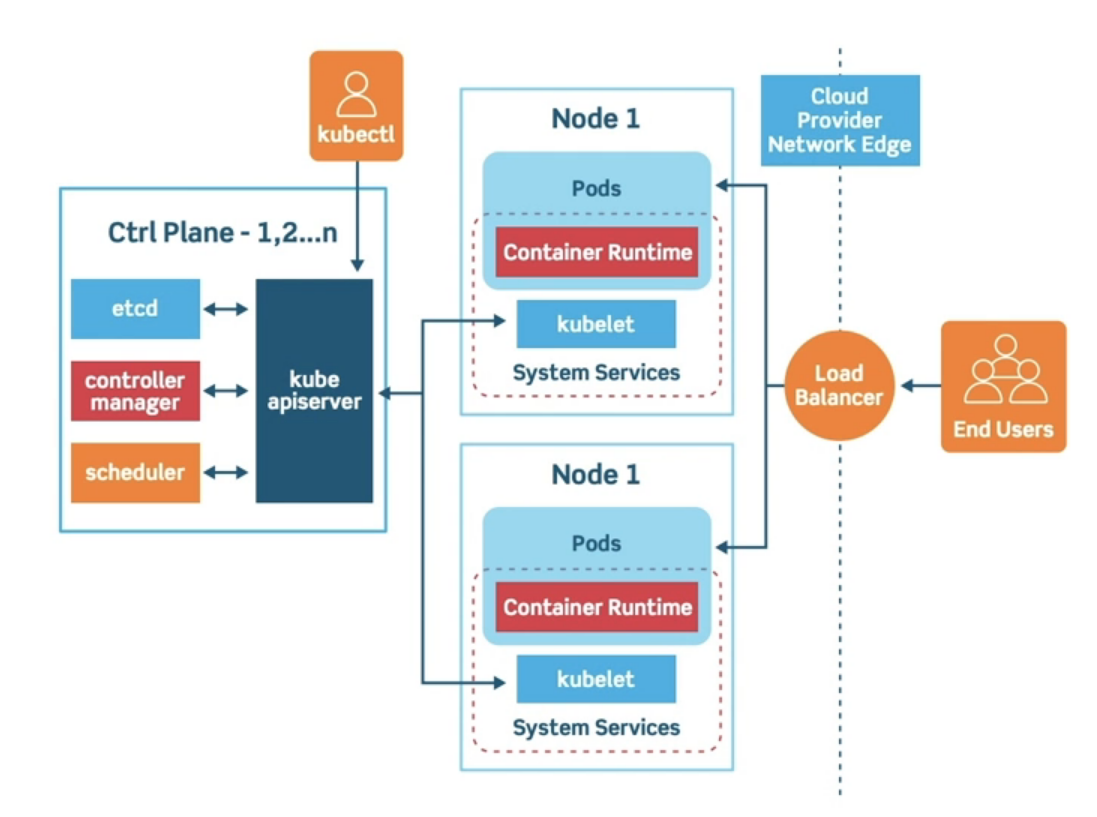 - 전통적인 3tier 아키텍쳐 관계처럼 클라이언트-백엔드 서버-데이터 서버의 역할을 하는 방식으로 master node(control plane)가 돌아간다.