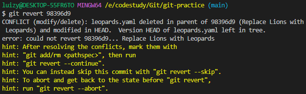 충돌이 생긴 revert의 문제를 해결 후 revert를 계속 진행시킨다.