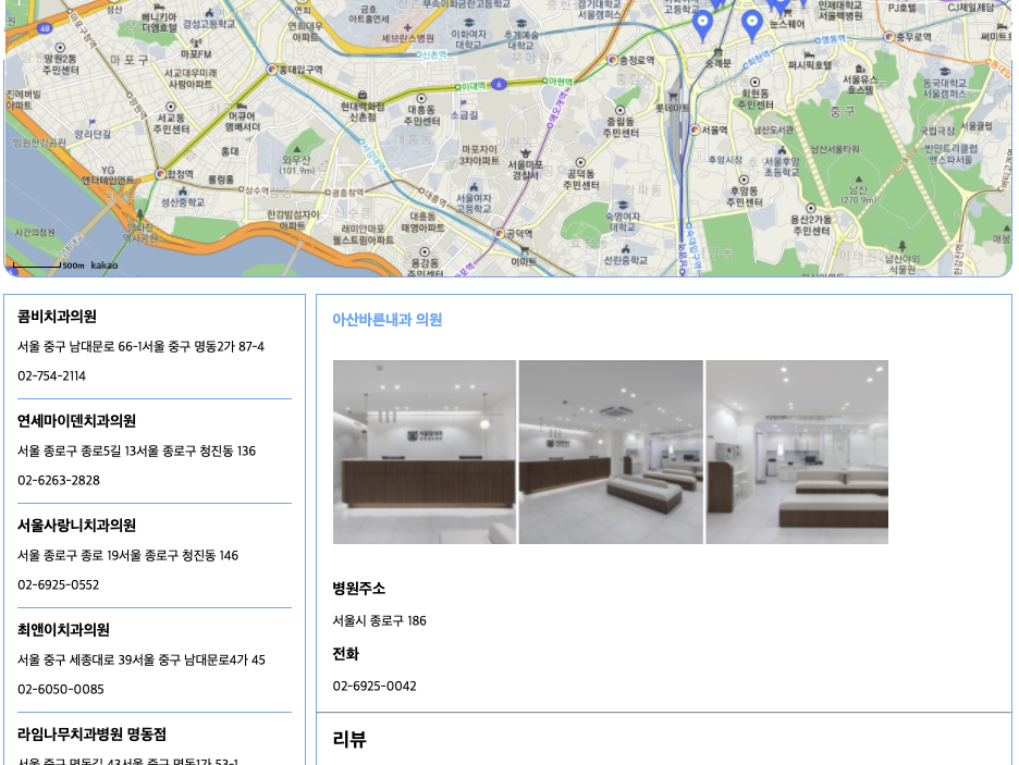 ํ์ง๋ง ๋ง๋ค์ด๋ณด๋ ์์ํ๋ ๊ฒ์ ๋นํด ํฑ์์ด ๋ถ์กฑํ ์ (๋ณ์์ด๋ฆ, ์ฃผ์, ์ ํ๋ฒํธ)์ด๊ธฐ์ ์์ธํ์ด์ง๋ฅผ ๋ฐ๋ก ๊ตฌํํ์ฌ ๋ง๋ค์ด ๋ด๋๊ฒ ์๋ฏธ๊ฐ ์์๊น ํ๋ ์๊ฐ์ด ๋ค์๋ค.