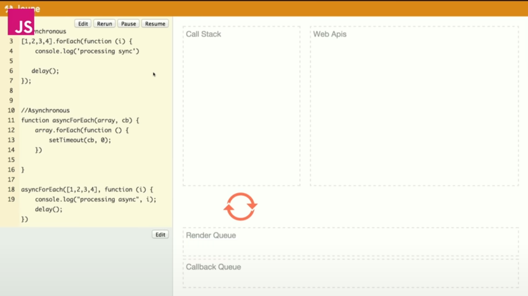 여기서 render queue(FIFO)를 생각하며 비동기식이 어떤 효과를 내는지 생각해보겠다. render queue는 call stack이 비어져있어야만 작동한다.