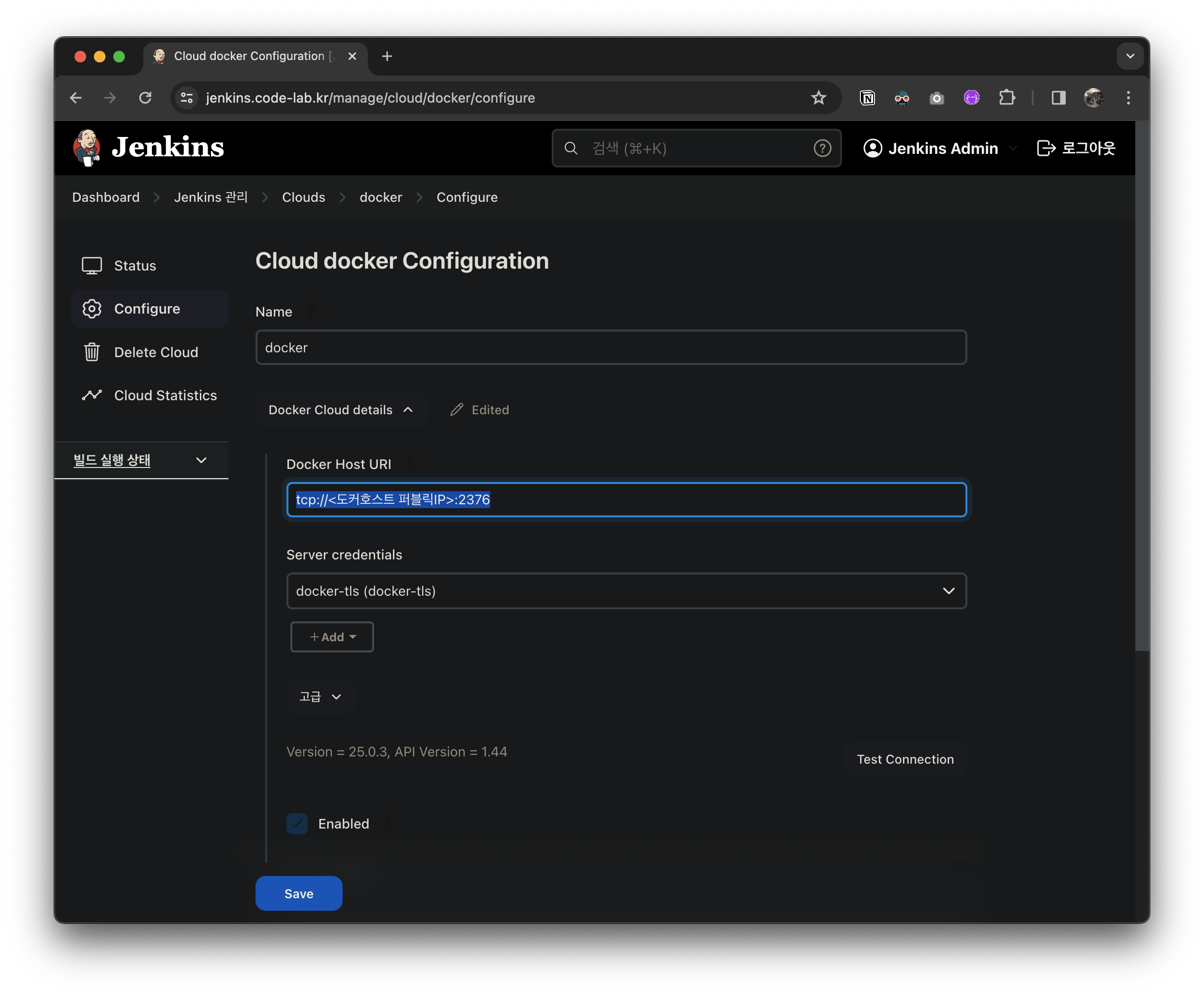 클라이언트(젠킨스 도커 클라우드)에서 tls 인증서를 사용하여 도커 호스트 및 포트로 접근하면 원격으로 도커 소켓을 사용할 수 있습니다.