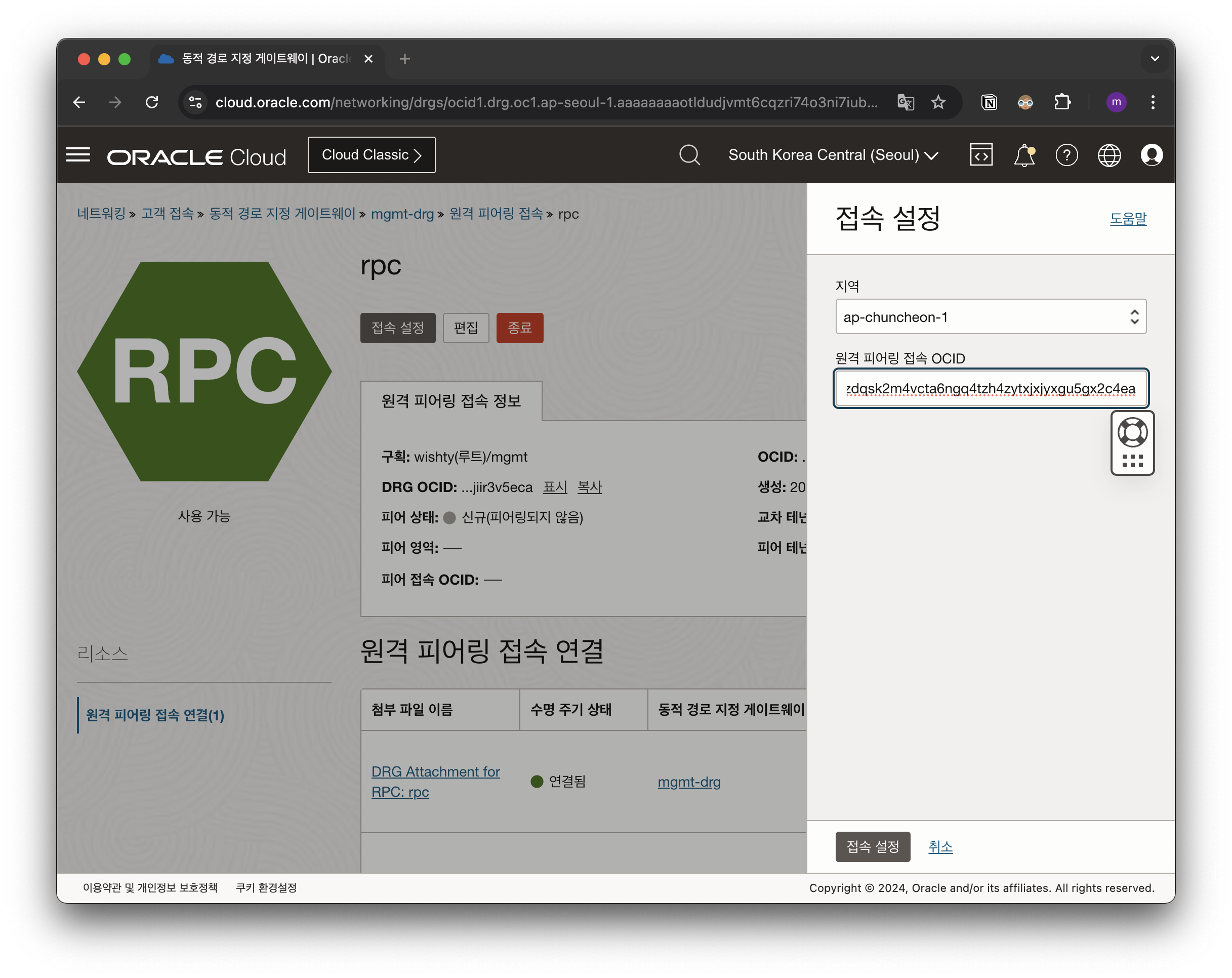 수신자 테넌시의 지역과 rpc ocid를 붙여넣고 [접속 설정]을 누릅니다.