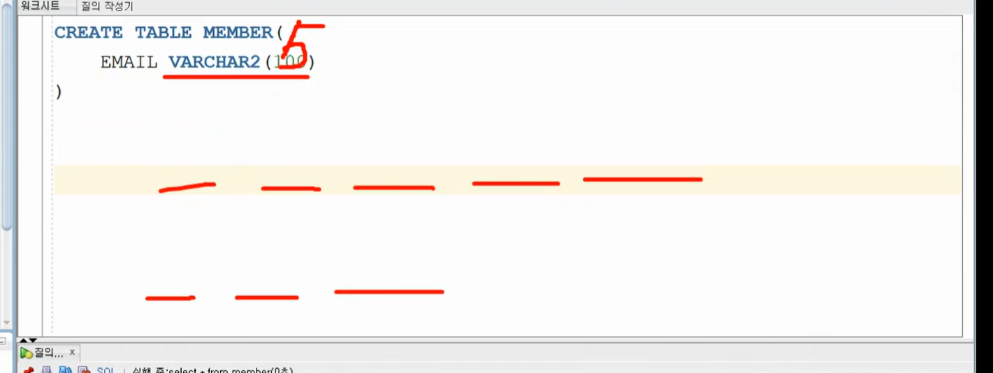 varchar2 가변적 , 조금 느림 5칸
