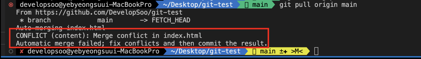 ex) git pull 명령어 입력 후 index.html 파일에서 충돌이 발생해서, 충돌 해결 후 다시 commit하라고 할 때