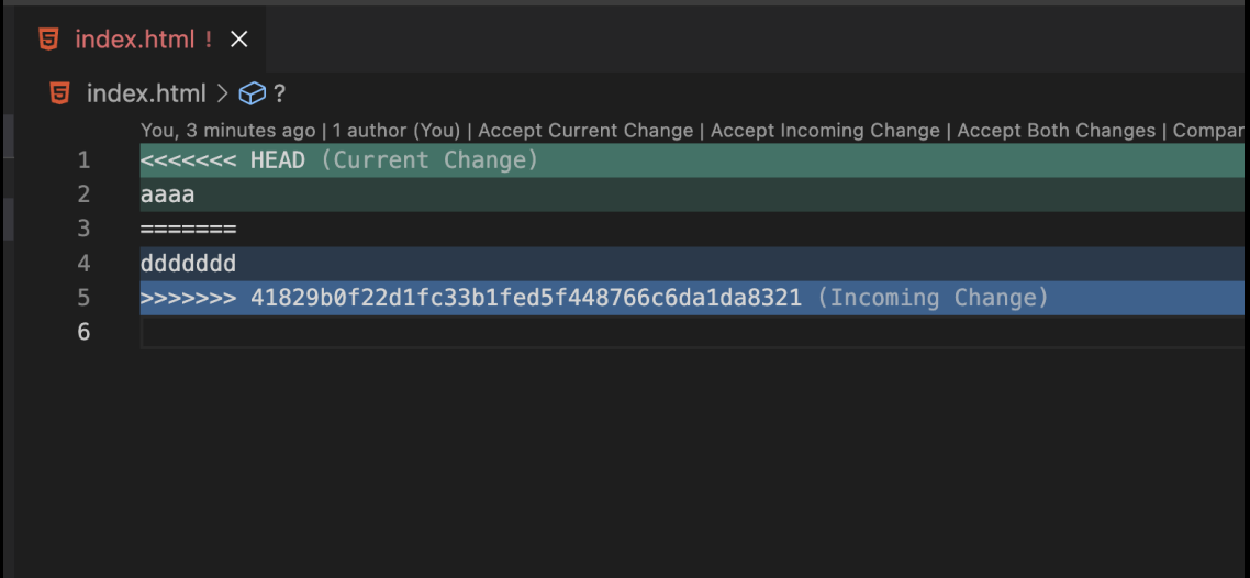 ex) Current Change : 내가 변경한 코드, Incoming Change : 다른 팀원이 변경한 코드. 둘이 충돌 나면 git pull 이후 아래와 같이 충돌된 상태를 보여줌