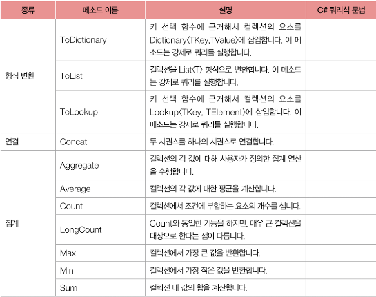 3.결과 처리: LINQ 쿼리를 실행하여 결과를 가져온다. C#에서는 쿼리를 실행할 때 LINQ to Objects, LINQ to XML, LINQ to SQL 등 다양한 방식으로 실행할 수 있다.