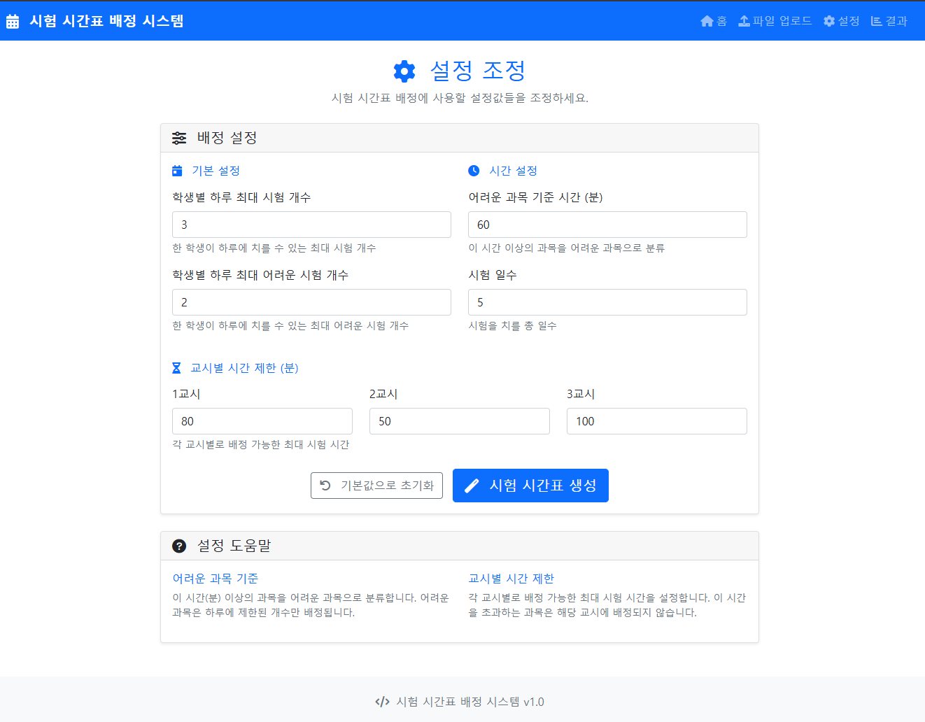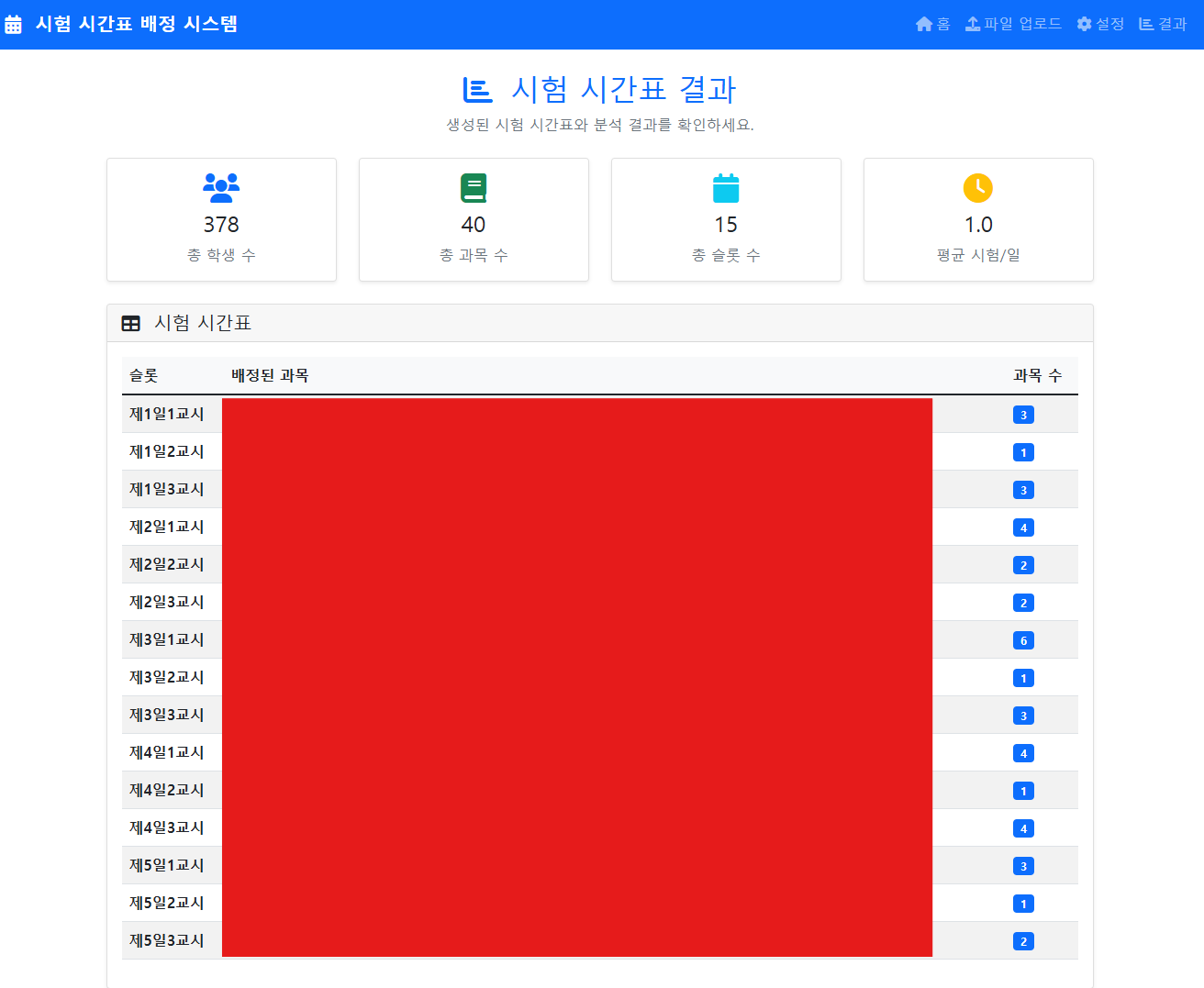 현재 시험 일수, 교시 개수, 교시별 시간 등이 하드 코딩 되어 있는데