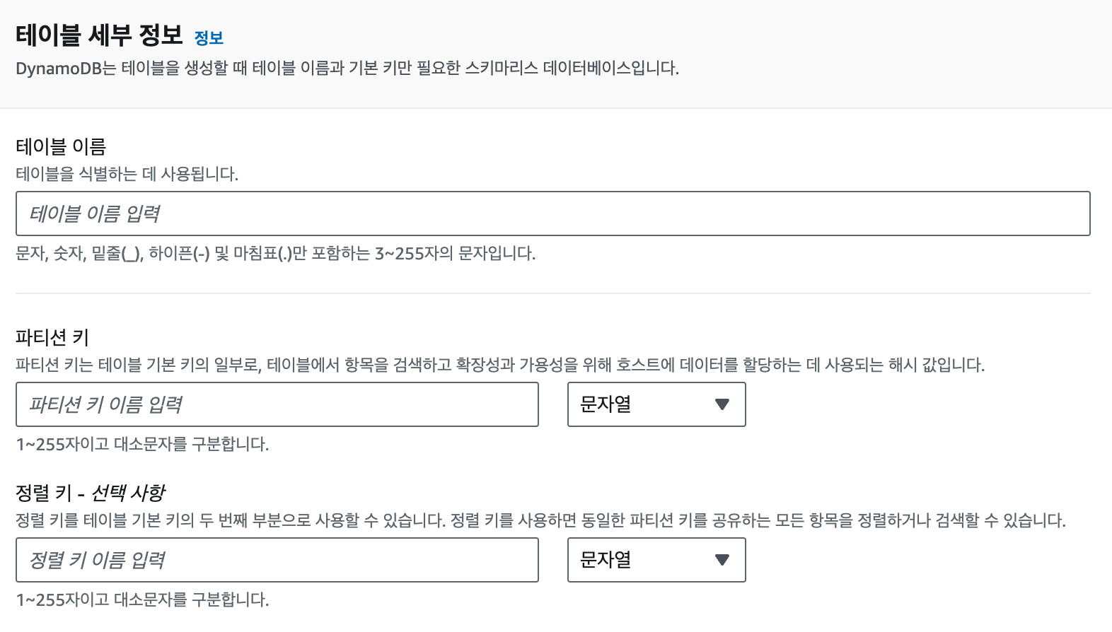파티션 키, 정렬 키를 설정할 때 사용할 테이블 내에서 기본적으로 조회 시 가장 중요한 항목을 선택하여 설정하였습니다.