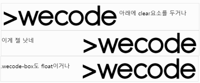 바깥 div(.wecodeBox)를 float시킨다. 그러면 자식의 float 높이를 인지하여 그만큼 높이를 차지하게 된다. 하지만,float이 되어버려 block 요소의 성질이 없어지게 된다. 이러면 width를 100% 추가하거나 해야한다.