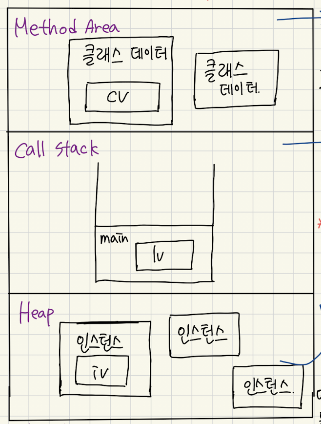- 프로그램 실행 중 어떤 클래스가 사용되면, JVM 은 해당 클래스의 클래스 파일을 읽어서 분석하여 클래스에 대한 정보(클래스 데이터) 를 메서드 영역에 저장한다. 이때 그 클래스의 클래스변수도 이 영역에 함께 생성된다.