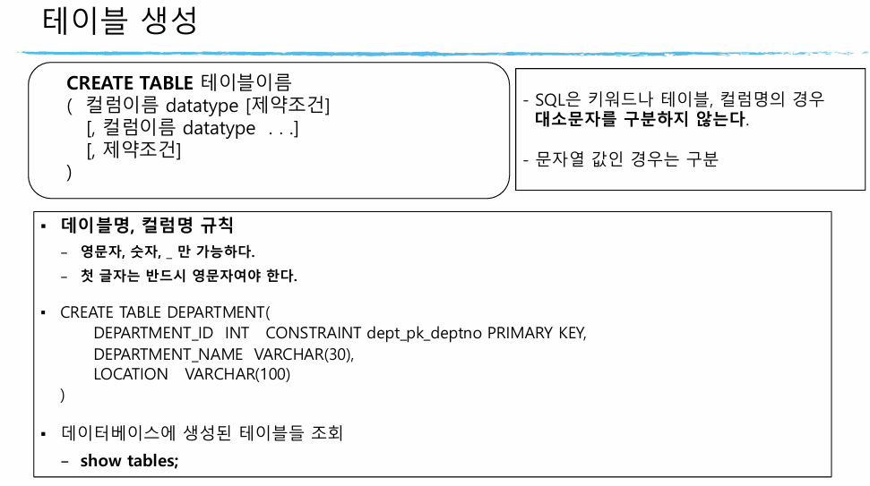 create table 테이블 이름 (컬럼명 데이터타입 [제약조건]) # 컬럼명, 데이터 타입은 필수