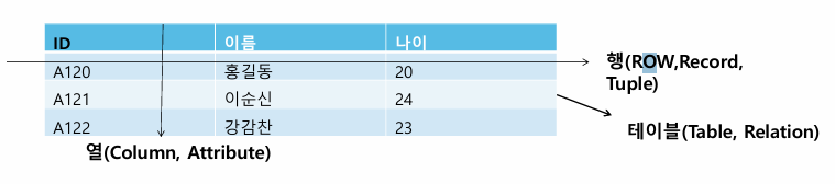↓ 테이블 : 열 - 데이터를 구성 / 행 - 하나의 데이터