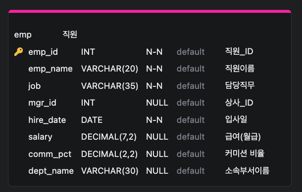 2) EMP 테이블에서 커미션비율(comm_pct)이 0.2~0.3 사이인 직원의 ID(emp_id), 이름(emp_name), 커미션비율(comm_pct)을 조회.