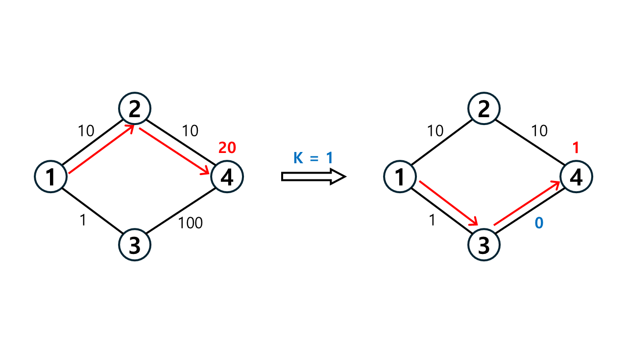 문제 예시에서 K가 3으로 주어지는 경우가 이러한 경우에 해당한다. 시작점에서 도착점까지 도로를 2개 거치는데, 도로 3개의 값을 무시하고 이동하면 도착점이 아닌 노드에 도달하게 된다.