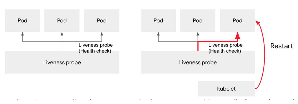 앱에 심각한 교착상태가 발생하여 무기한 중단되고 요청처리가 중단되는 시나리오를 상상해보겠습니다. 프로세스가 계속 실행되기 때문에 기본적으로 kubernetes는 모든 것이 정상이라고 생각하고 손상된 Pod를 요청보냅니다. liveness probe를 사용하여 더이상 요청을 처리하지 않는다는 것을 감지하고 pod를 재실행시킵니다.