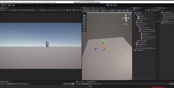 WASD키를 입력하여 이동할 수 있고 카메라가 바라보는 방향을 기준으로 전후좌우로 움직일 수 있다.