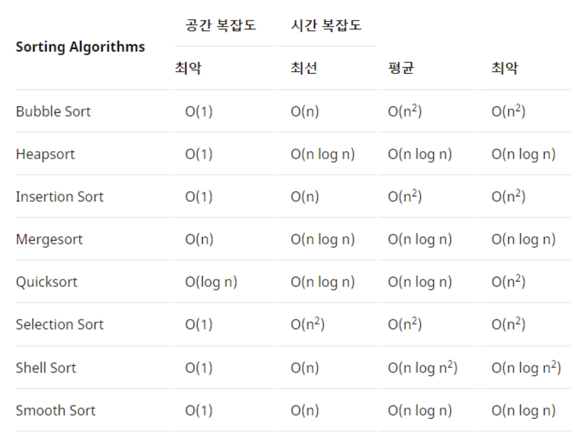 | 타입 | 내부 알고리즘 | 시간 복잡도 | 공간 복잡도 | 안정성 |