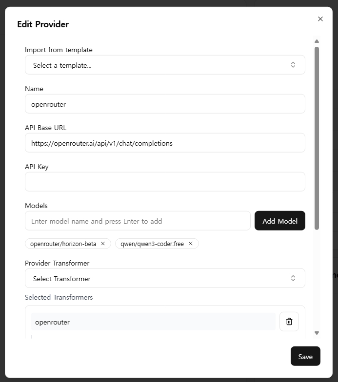 어쨌든 템플릿에서 OpenRouter 선택, 발급받은 API Key 입력한 다음, 모델을 선택할 건데,