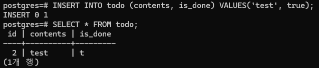 INSERT INTO todo VALUES(contents, is_done) VALUES('test', true);