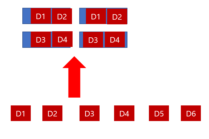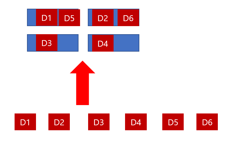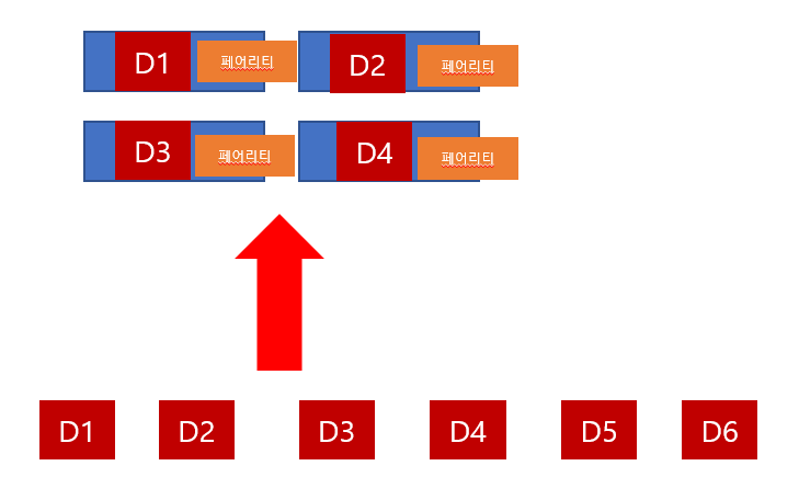 λ°μ΄ν°μ ν¨λ¦¬ν° μ 보λ₯Ό μ¬λ¬ λμ€ν¬μ λΆμ°νμ¬ μ μ₯νλ€.