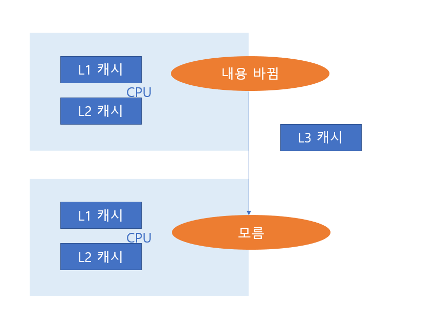 ๋ค๋ฅธ ์ฝ์ด์ ์บ์ ๋ฉ๋ชจ๋ฆฌ๋ ์ค์๊ฐ ๋๊ธฐํ ์ํค์ง ๋ชปํด์ ๋ฐ์ํ๋ ๋ฌธ์ ๊ฐ ์๋ค.