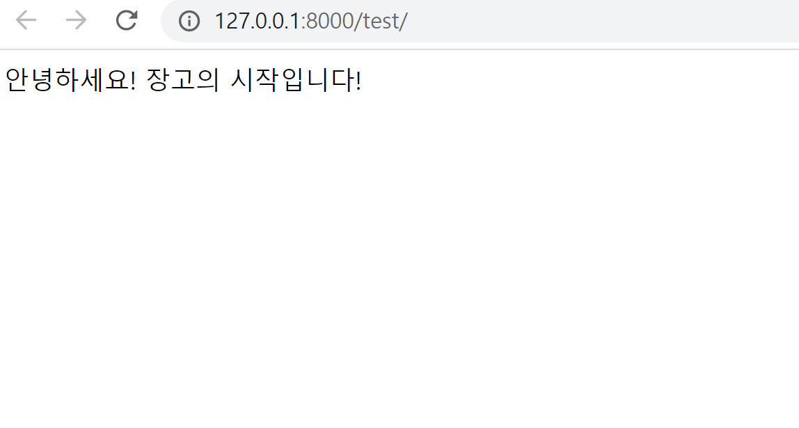 test라는 url로 base_response라는 함수와 연결시킨다고 생각하면 될 것 같다. 이렇게 하면 test페이지에 HttpResponse를 통해 받아온 내용이 보이게 된다.