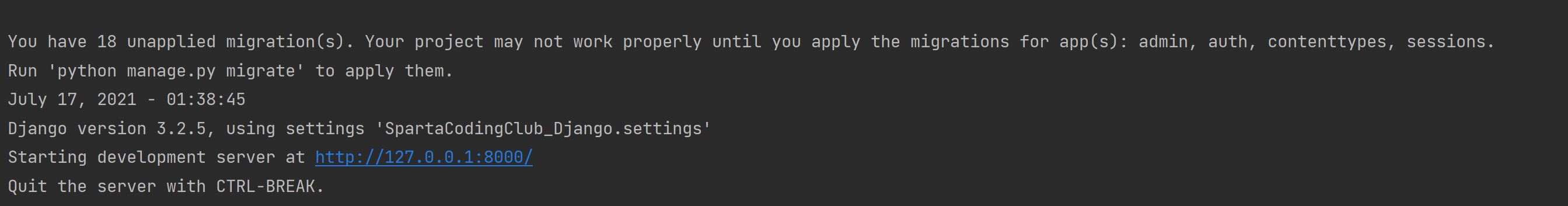 이렇게 url이 나오게 되는데, 링크를 클릭하면 장고에서 기본적으로 만들어 놓은 페이지를 보게 된다.