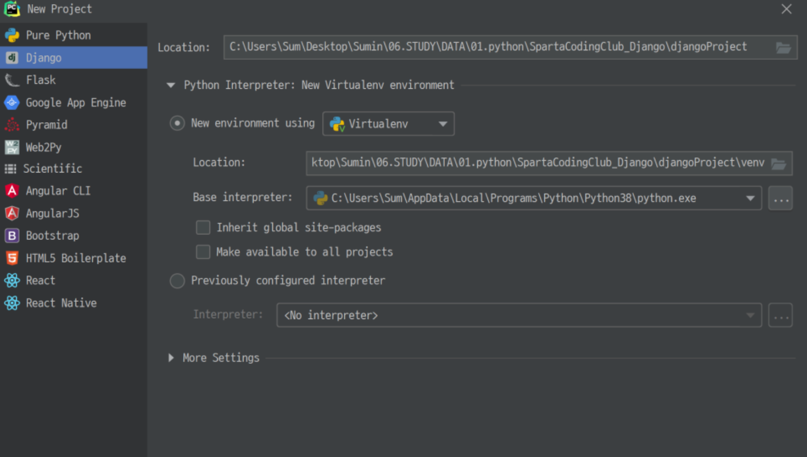 New Project를 누르고 장고를 선택해 새로운 장고 프로젝트를 만들어준다. 이 때 New environment using에 Virtualenv를 선택해 가상환경에서 사용할 수 있도록 한다.