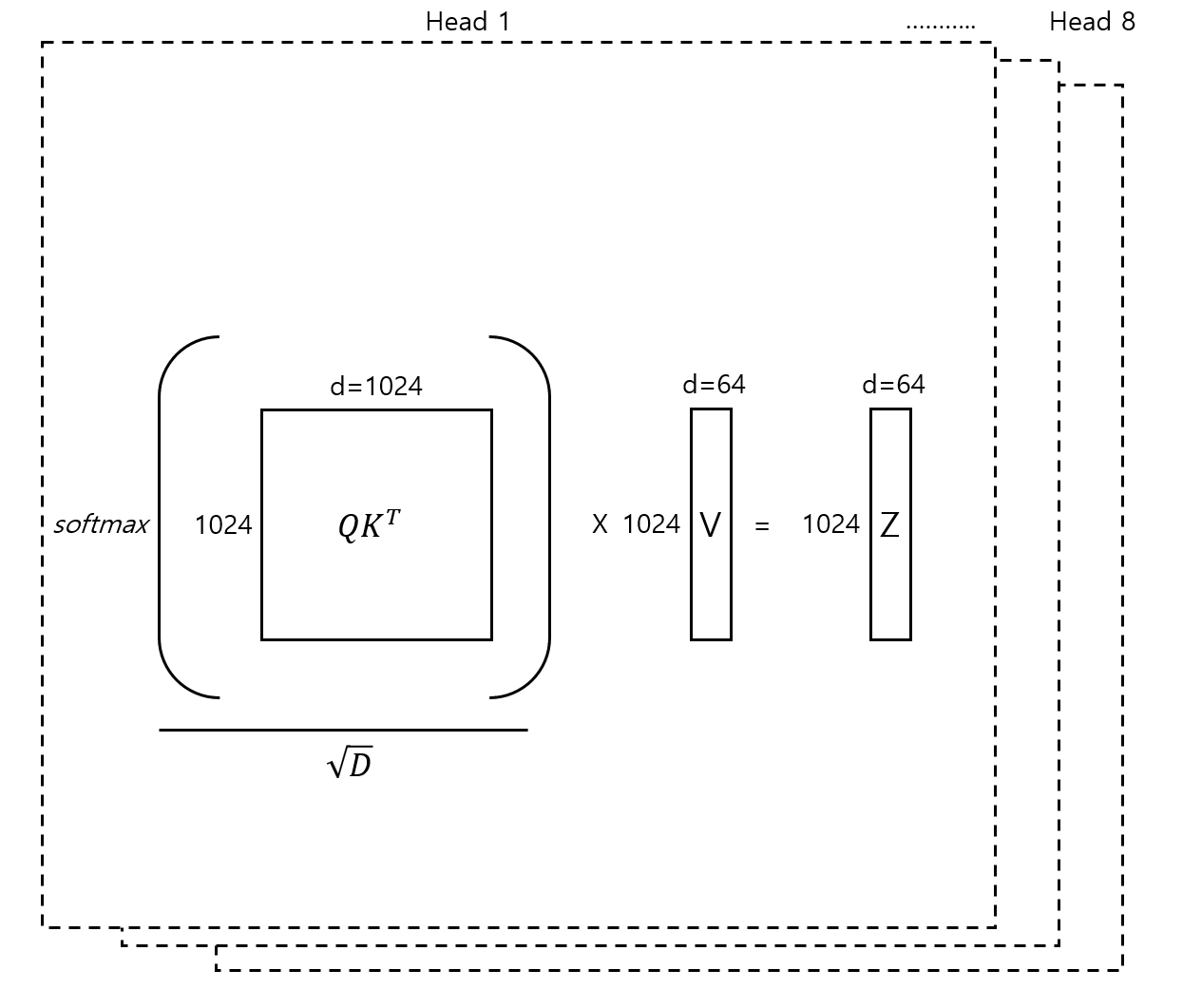 각 head에선 차원의 수가 작아졌을 뿐, 동일한 scaled dot-product attention이 적용되며 이 작업은 병렬로 처리된다. 논문에선 각 head의 차원이 축소됨에 따라 single-head attention과 크게 computational cost 차이가 나지 않는다는 것 또한 강조한다.