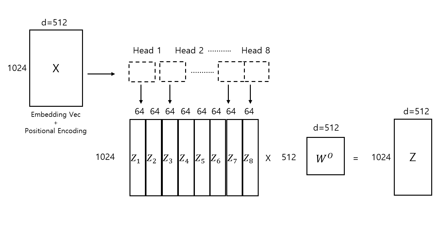 서로 다른 subspace에서 attention을 적용한 결과인 각 head의 output vector에 대해 concatenation을 진행하고 선형변환을 하여 최종 output vector는 input vector와 동일한 shape을 갖게 된다.