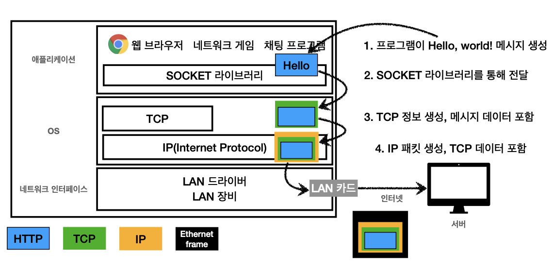 TCP/IP패킷의 데이터를 네트워크 인터페이스 계층에 전달해서 LAN 카드를 통해 이더넷 프레임 포함해서 인터넷 거쳐서 서버에 전달