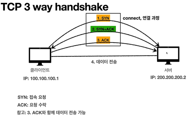 3 way handshake는 SYN => SYN+ACK => ACK 과정을 거쳐서 송수신부의 연결상태를 확인 후 데이터 전달을 함