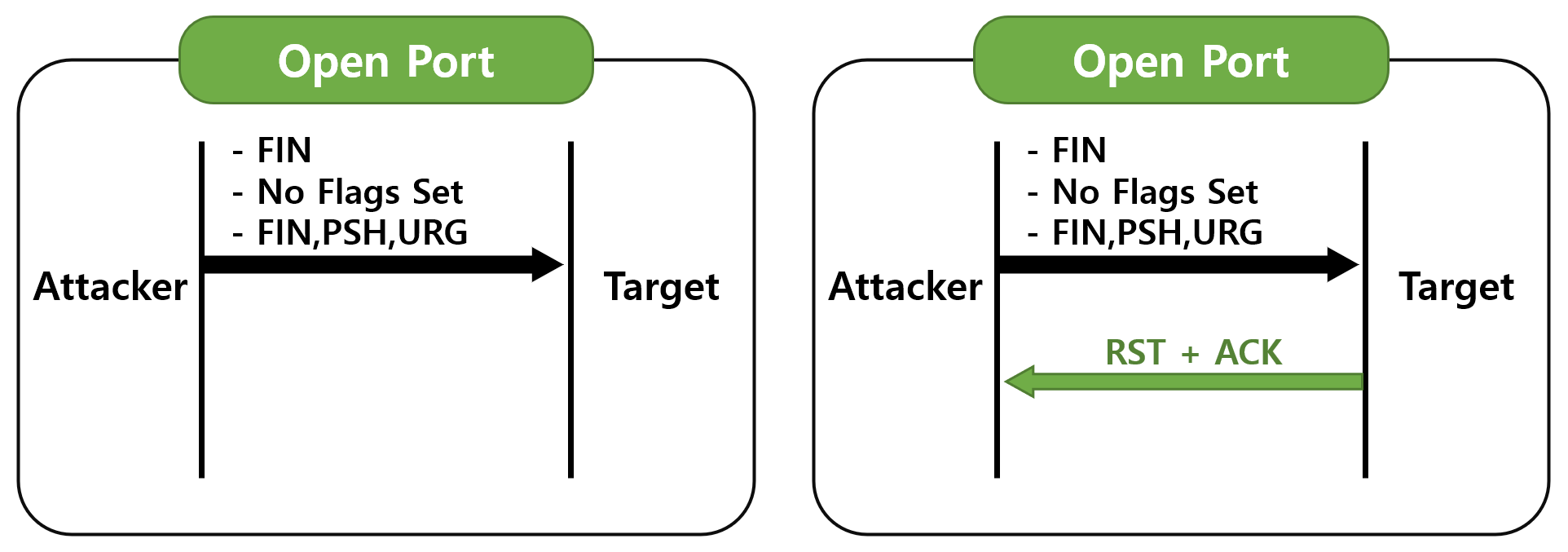 • TCP 표준 동작 방식을 준수하는 시스템이라면 SYN, ACK 또는 RST이외의 패킷을 수신한 경우 닫힌 포트에서는 RST패킷으로 응답하고 열린 포트에서는 응답하지 않음