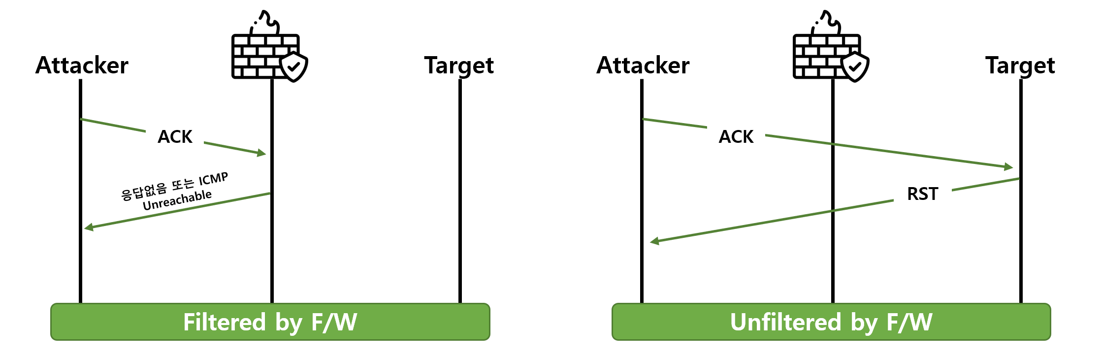 • 방화벽에서 허용된 경우 Target 호스트의 오픈 여부와 상관없이 RST을 수신하기 때문에 포트 오픈 여부를 판단할 수 없음