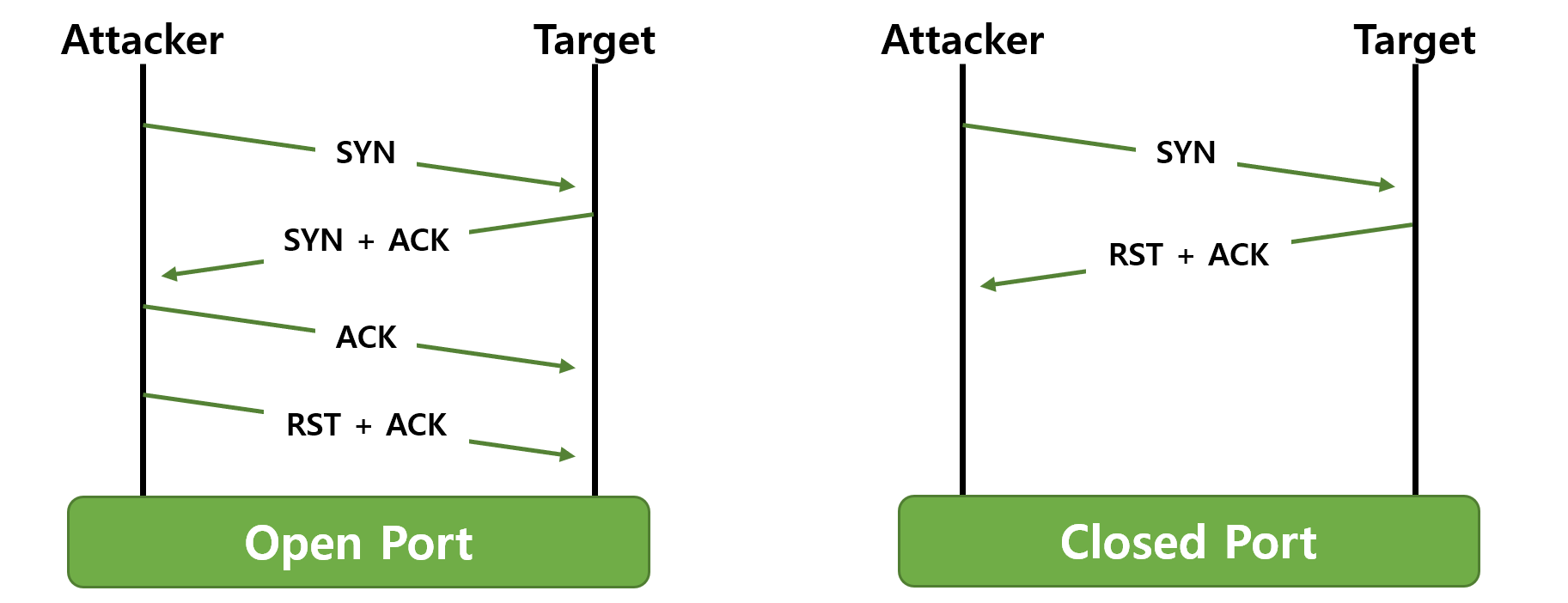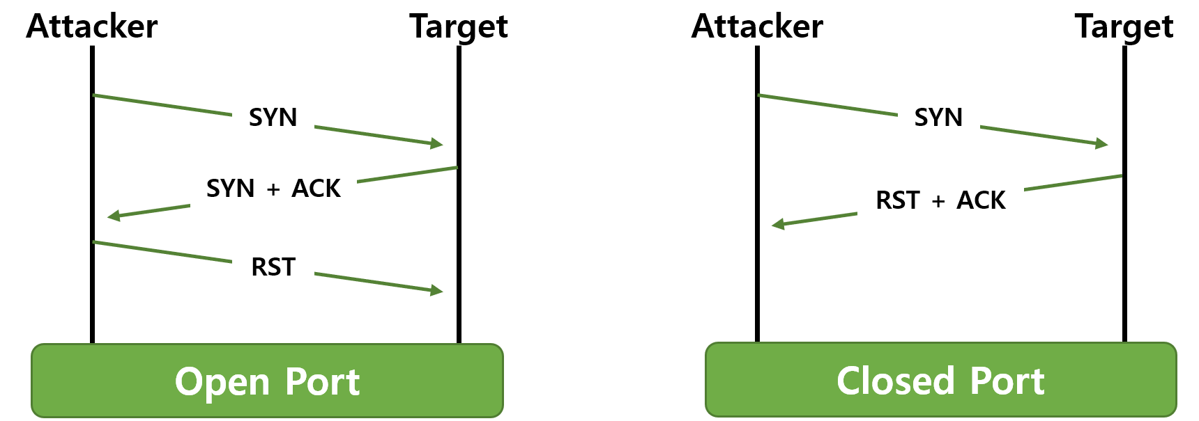 : TCP 세션이 완전히 성립되지 않은 상태에서 대상 시스템의 포트 활성화 여부를 스캔하는 방식