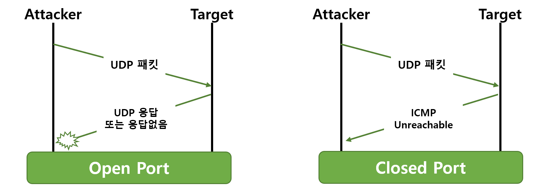 UDP 포트 오픈 여부를 판단하는 스캔 방식으로 닫힌 UDP 포트로 패킷 수신 시 ICMP 에러 메시지로 응답하는 특성을 이용함