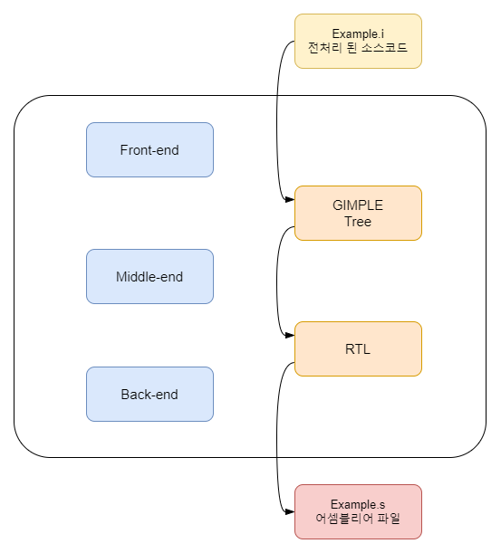 프론트엔드에 의해 GIMPLE의 대상이 정해지고, 미들엔드에 의해 최적화된 명령형 프로그래밍 구조의 하위 집합만을 포함하게 됨