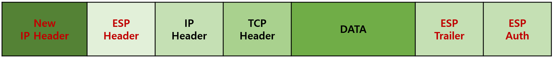 - 원본 IP 패킷 전체와 ESP 트레일러를 암호화하고 암호화된 데이터와 ESP 헤더를 인증