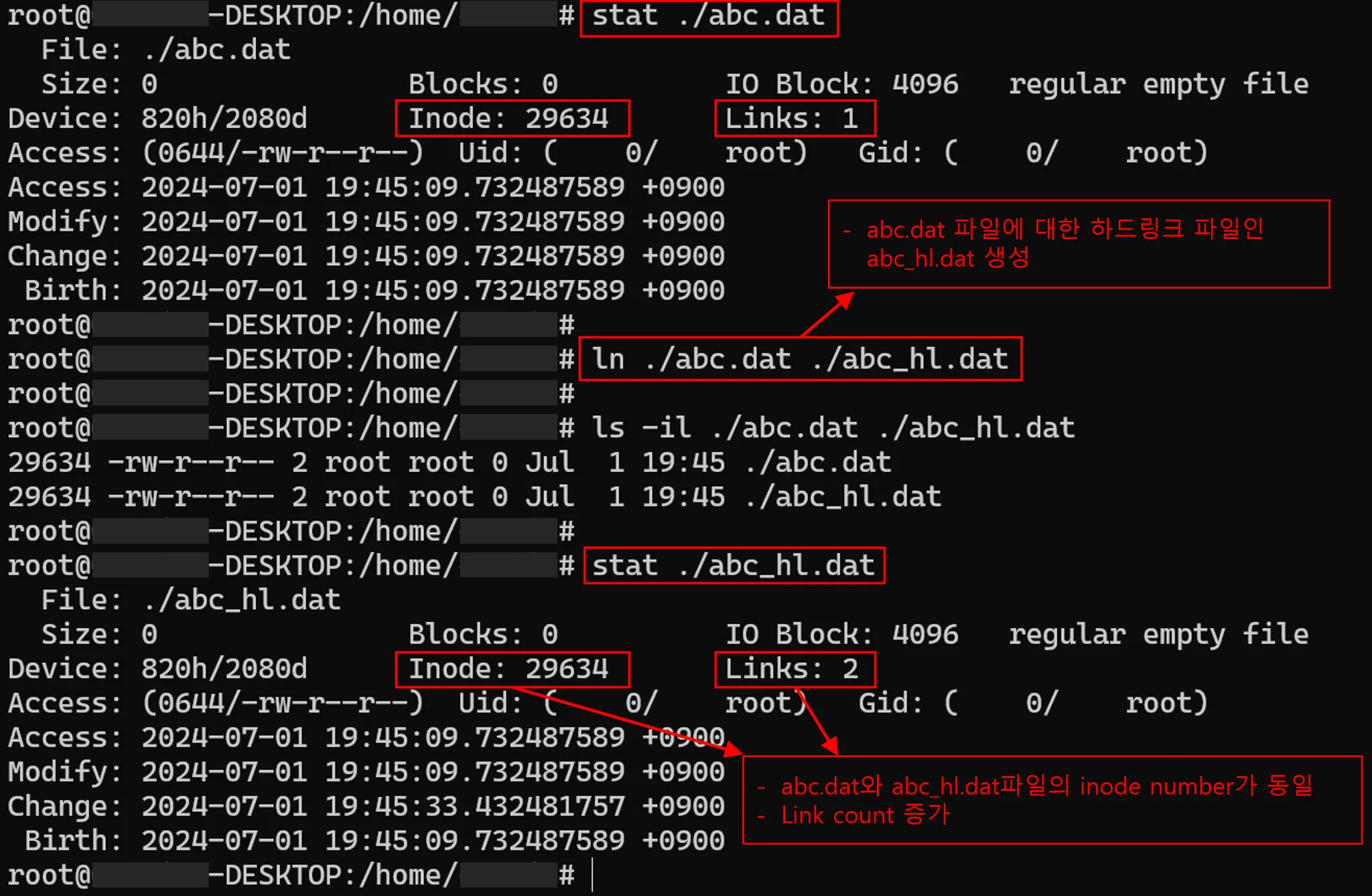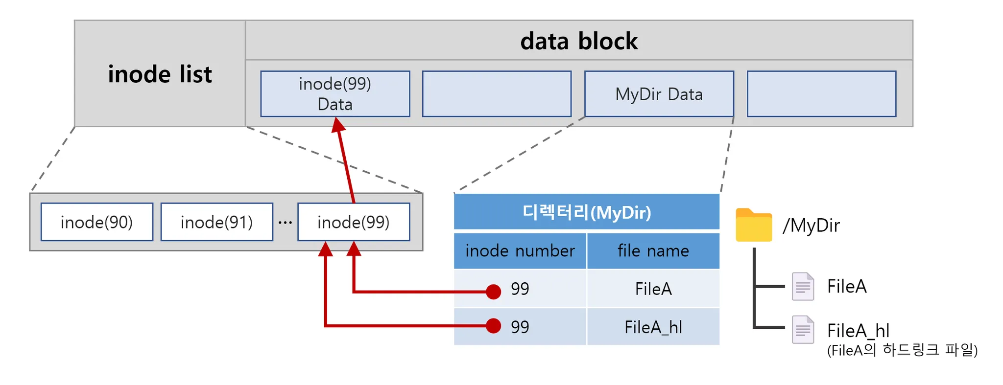 - 동일 파일시스템에서만 가능하며 디렉터리는 하드 링크가 불가능