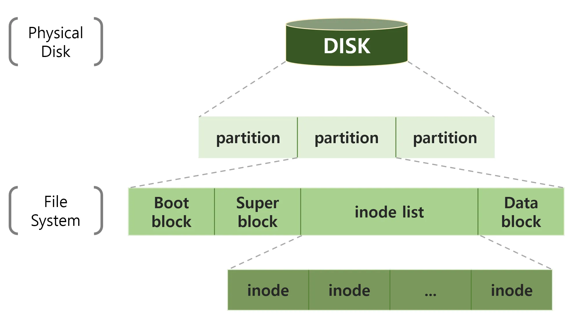 물리적인 저장장치는 논리적인 파티션(partition)으로 나누어지며, 파티션 별로 고유한 파일 시스템을 생성함