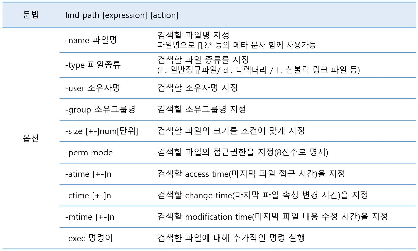 EX) e.g find / 검색_조건(expression) : 최상위 루트 디렉터리 이하 파일 검색