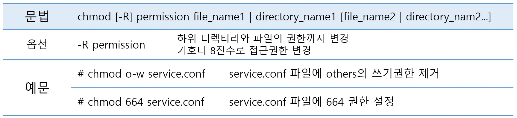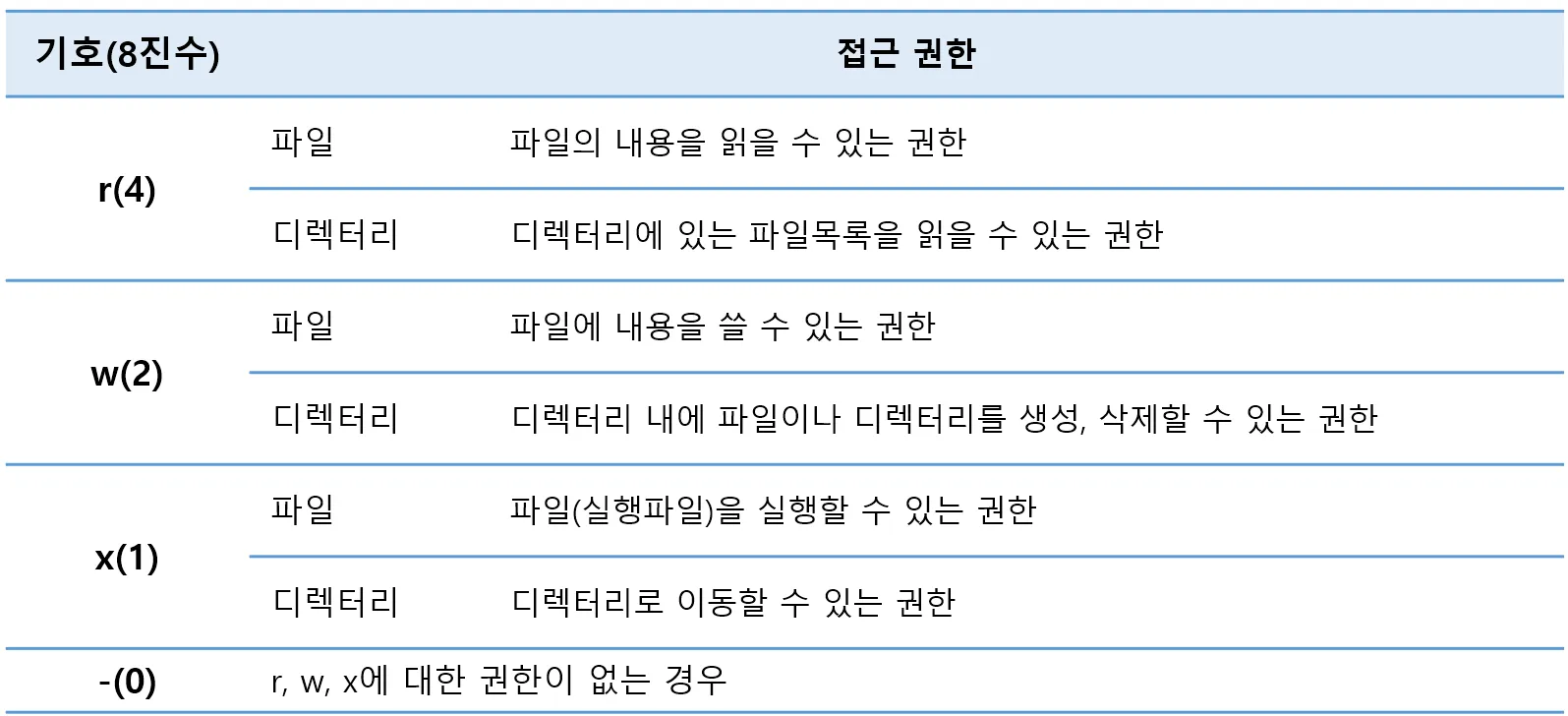 기타사용자(Others) | 소유자와 소유그룹에 속하지 않는 모든 사용자의 접근 권한 |